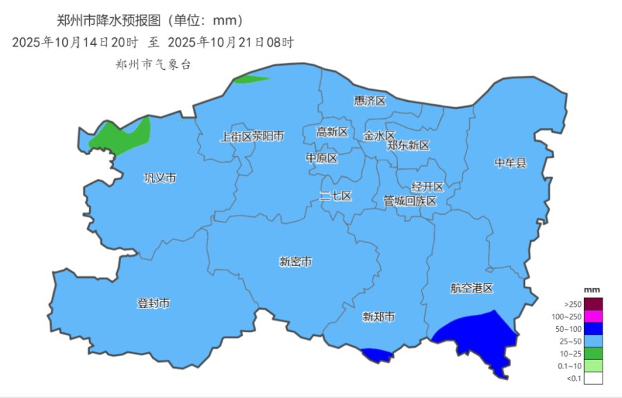 2025年10月14日20时至21日08时郑州市累计降水预报