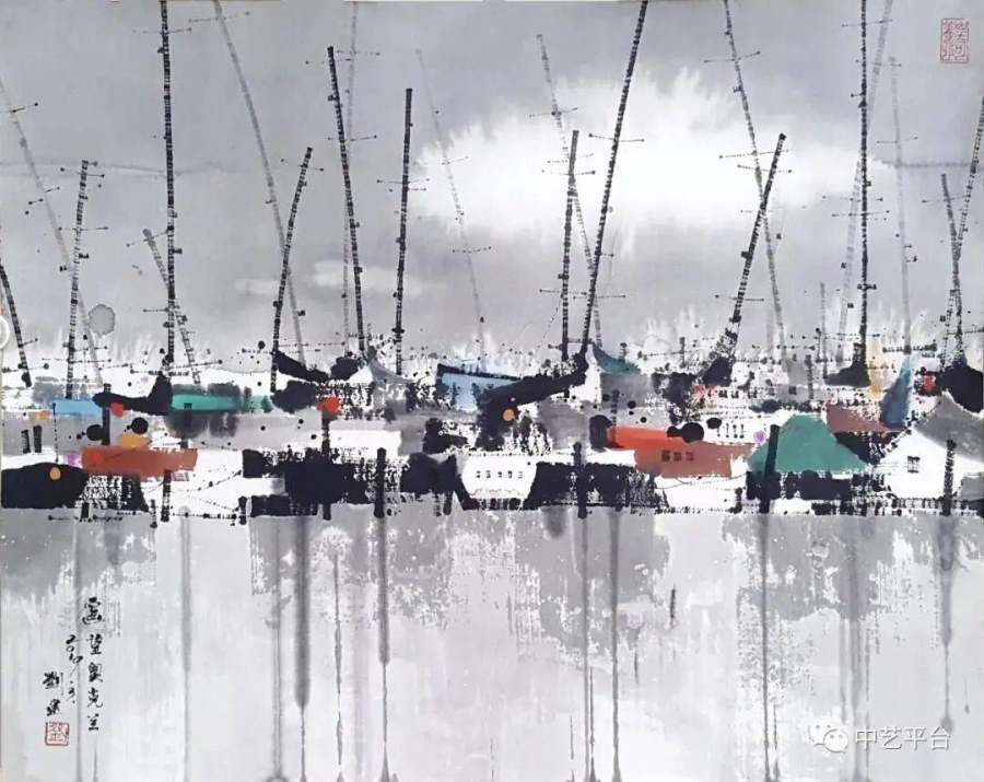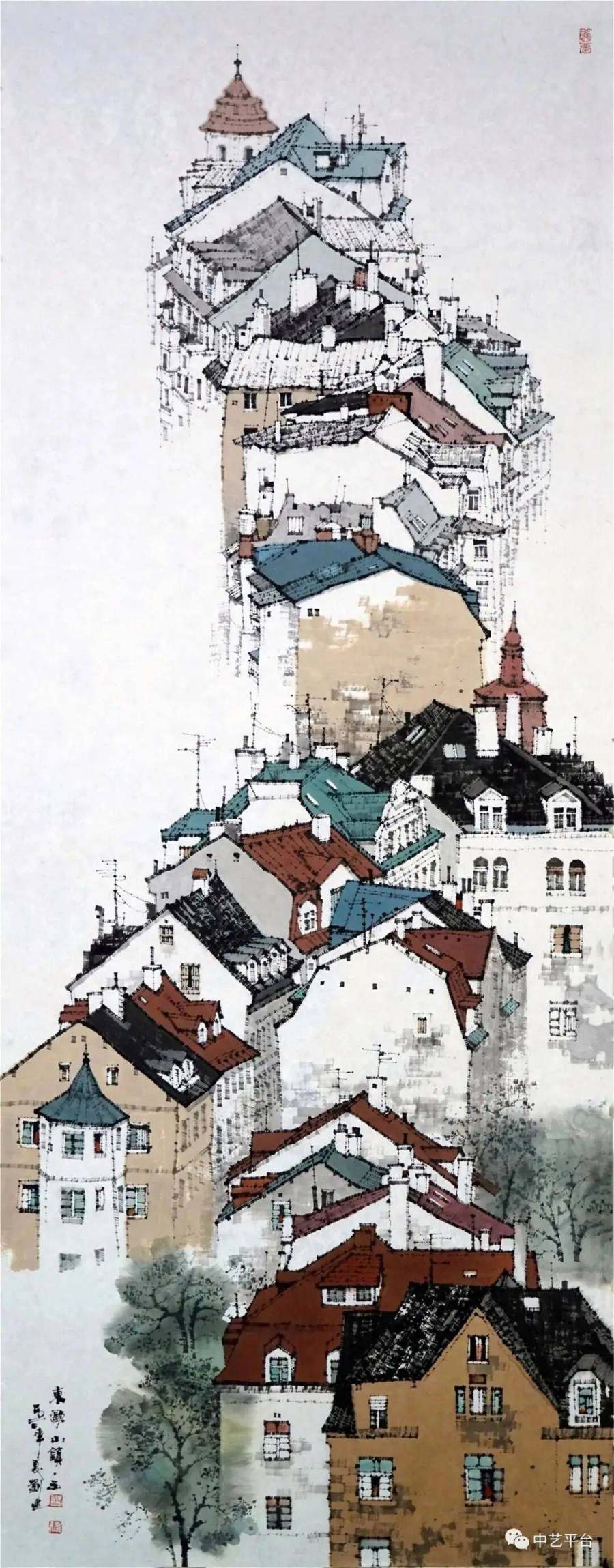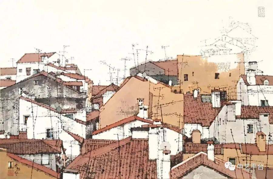 当大多数山水画家仍在描摹崇山峻岭时,刘建已将视角转向人类聚落——村庄、小镇、都市。他的"城市山水"系列,打破了山水画与界画的界限,为传统画科注入了现代性思考。