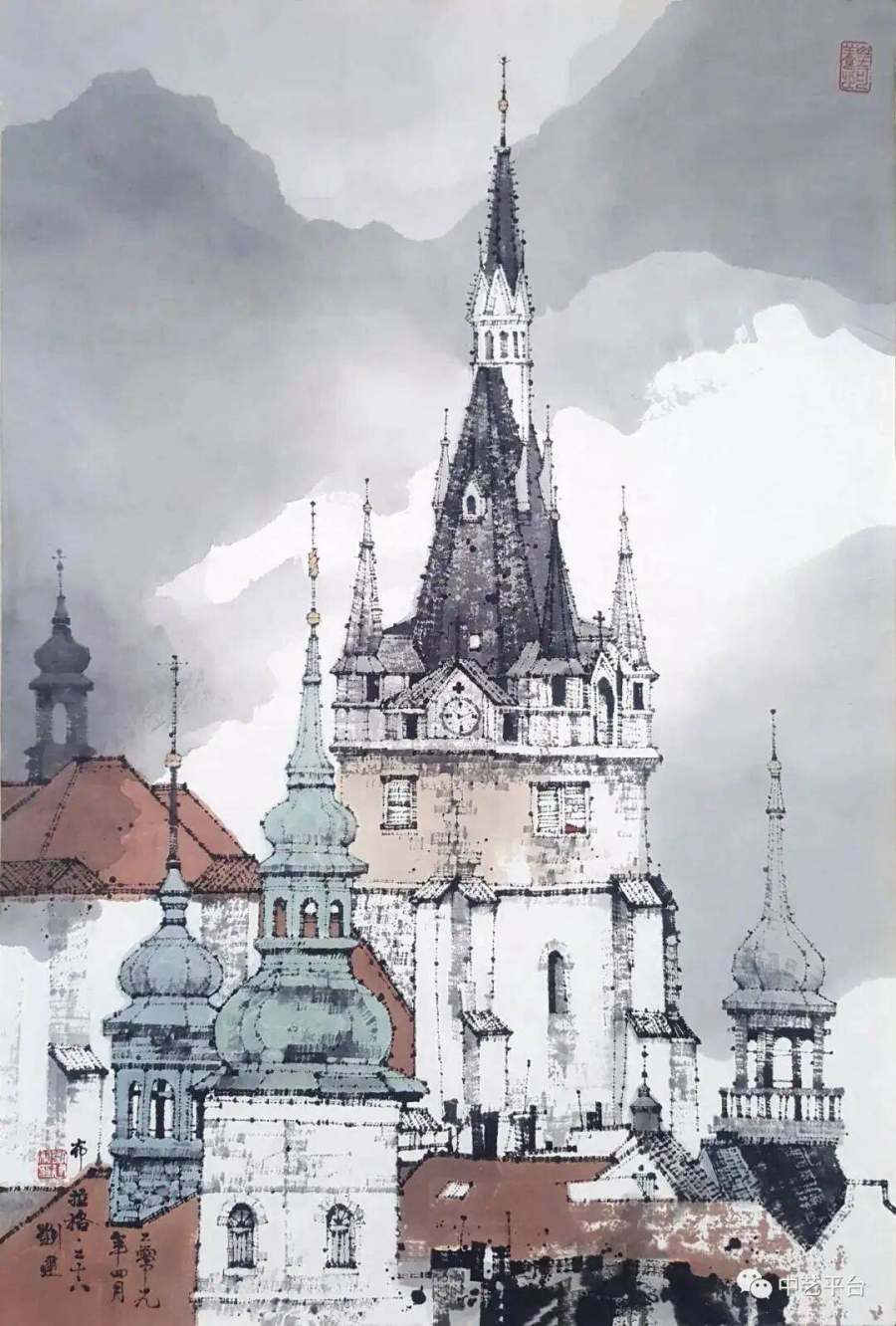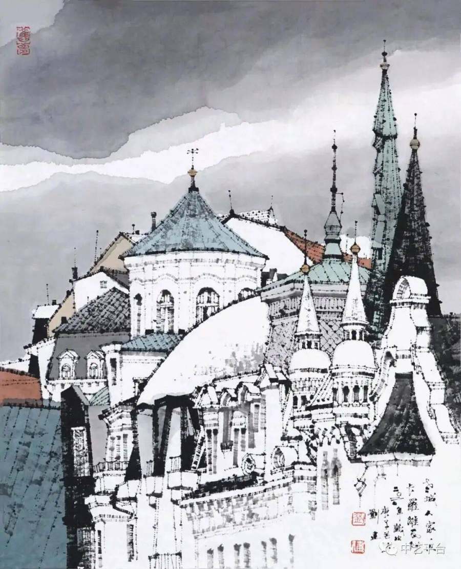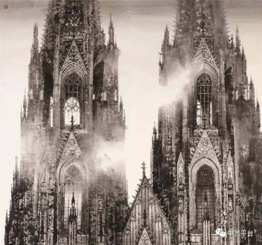 在《科隆大教堂》(2009)中,他用凌厉的直线切割空间,以浓墨重彩勾勒飞扶壁的升腾感;在《布拉格·真理终将胜利》(2013)中,他将哥特式塔楼化为墨色交响,让观者仿佛听到管风琴在纸间轰鸣。周韶华评价这批旅欧作品时感叹:"他不仅追求建筑的形式美,更开掘出文化历史的亮点…这是最有创意的新山水画。"
