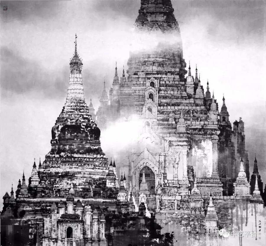 在《皖南老巷》(2014)中,他用大块留白表现阳光倾泻,以焦墨枯笔勾勒墙垣肌理,灰调的瓦片如音符般跳跃;在《蒲甘》(2012)中,他将缅甸佛塔群转化为墨色梯度,让金色佛国在水墨中获得新的生命。邵大箴精准概括道:"他得心应手地处理黑白灰的层次,在墨色交错中形成独特色调效果。"