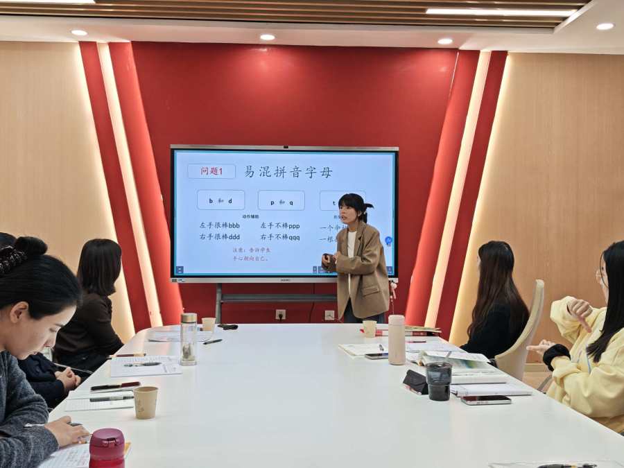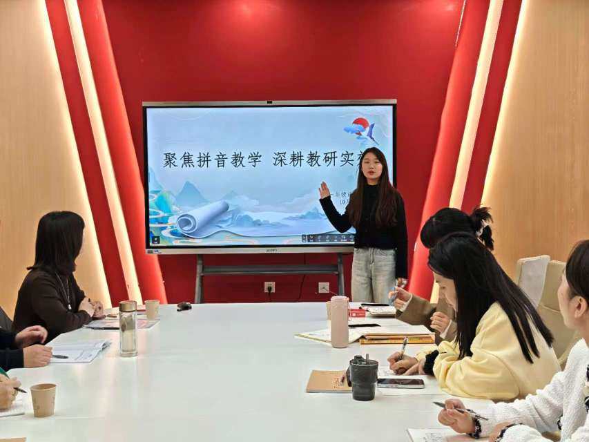 西流湖小学一年级语文教研组长吴思瑶老师则立足本校学情,分享了学校在拼音教学方面的实践心得与探索路径。她介绍了如何利用校本资源、家校共育等方式,巩固课堂所学,营造良好的拼音学习氛围,展现了学校在教学实践中的扎实积累与个性化思考。