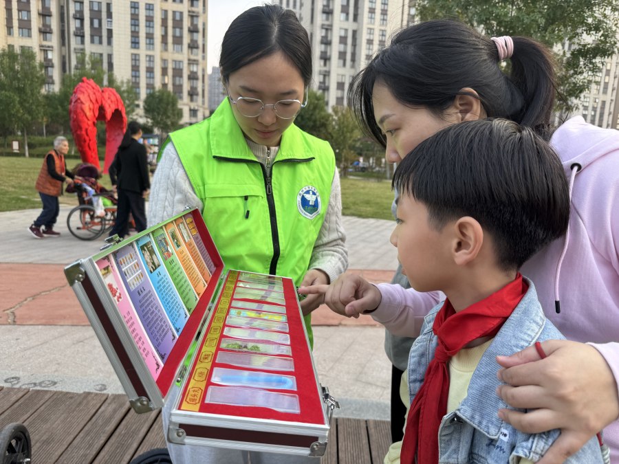 活动现场,身着郑州禁毒绿色马甲的禁毒社工,成为公园里一道亮眼的风景线。禁毒社工手持禁毒仿真模型展示箱,箱内整齐陈列着多种毒品的仿真模型。“大家看,这些包装看似普通零食,其实可能是新型毒品伪装的,像这种像糖果、跳跳糖、果冻零食一样的东西,这些都是毒品的伪装形式。”家长们带着孩子,认真聆听讲解,并不时提问,禁毒社工一边展示,一边用通俗易懂的语言,详细介绍各类毒品的外观特征、危害以及常见的伪装手段,让居民们对毒品有了更直观的认识。