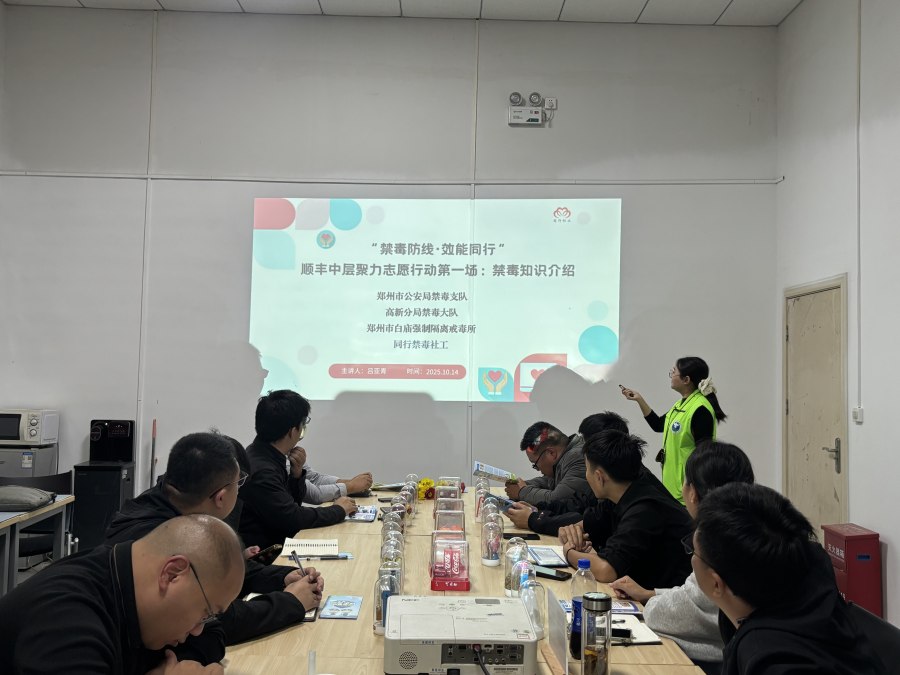 项目非常重视企业管理层在推动这项工作中的关键作用。“顺丰中层聚力行动”旨在激发和调动顺丰公司中层管理人员的积极性与领导力,他们是公司政策传导、组织动员的核心环节。下午,针对顺丰中层的专项培训在惠济区顺丰速运隆兴点部正式启动,禁毒社工主要从常见毒品类型、毒品危害、快递涉毒案例分析以及防范措施与流程这四个方面科普禁毒知识,让在场管理者频频点头。在仿真模型学习环节,伪装成奶茶粉、香水、巧克力的毒品仿真模型整齐排列,管理者们围在桌前,或俯身观察,或轻声交流,有的还戴上手套拿起模型仔细触摸,禁毒社工在从气味、重量到包装细节耐心讲解每种模型的识别要点,使抽象的“识别技巧”变成了可触摸、可记忆的“实操指南”。