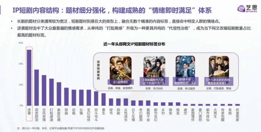 最近,艺恩发布的《网文IP短剧开发价值洞察报告》指出,近一年,短剧改编授权新增1600部,同比增加81%。近一年头部网文IP短剧题材中,以“逆袭”为标签接近40%,位列TOP1,远超过“现言甜宠”。观众想从逆袭短剧中获得的代偿性治愈,而逆袭正是男频赛道的一大主流题材。