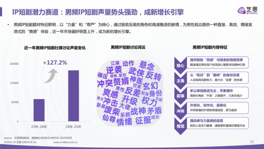 艺恩报告显示,近一年男频短剧的市场偏好明显上升,男频IP短剧的社媒讨论声量上涨了127.2%。男频IP短剧题材特征鲜明,以“力量”和“尊严”为核心,通过极致反差角色和高速推进的剧情,为男性观众提供一种直接、高效的爽感体验,男频短剧正在成为新的增长引擎。