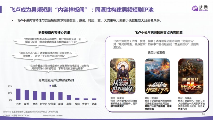 飞卢小说网是大多数头部男频小说作家的起源地,其独创的“飞卢风”以极强的节奏感、巨大的脑洞和密集的爽点为核心,飞卢小说IP也是多数爆款男频短剧的改编来源。