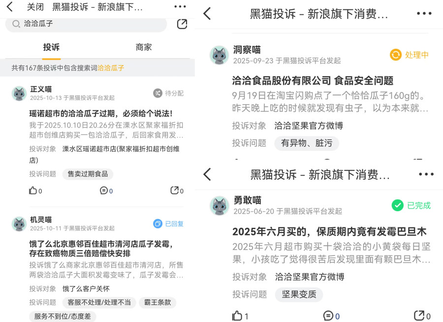 在黑猫投诉平台,产品质量问题亦是洽洽食品被投诉的重灾区,包括“有虫卵”“瓜子坏果多”“发霉发苦”等。