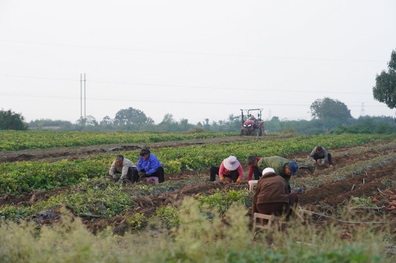 在红薯基地,红薯收割机在田地间来回穿梭,一个个饱满的红薯破土而出,10余名村民忙着清理泥沙、按照大小挑拣分选,装箱入车。