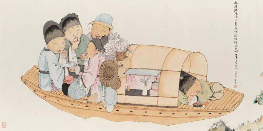 其画造型坚实,用笔精准,刻画入微。这些特点在本画中有鲜明体现。该画将人物画与界画结合一体,人物、大船、小舟,各色人物的形貌、神情、举止,舟船的形态、结构及其质地和装饰细节,都被一种高超的工笔画技术所驯服,描绘极见精美。但严谨的细节并未妨害整体的表现。这是因为画家深谙中国传统画的“以大观小”之道,始终以整体的意识对待笔下的形象,胸有成竹,举重若轻。其构图,紧凑而疏密有致;其用线,连绵而若断还续;其设色,沉厚而明澈通透。我们有理由认为,尽管画家用了工笔的技巧作画,却自始至终带着写意的胸次来完成他的作品,可谓入之以工,出之以写,或曰落笔为形,起笔见意。