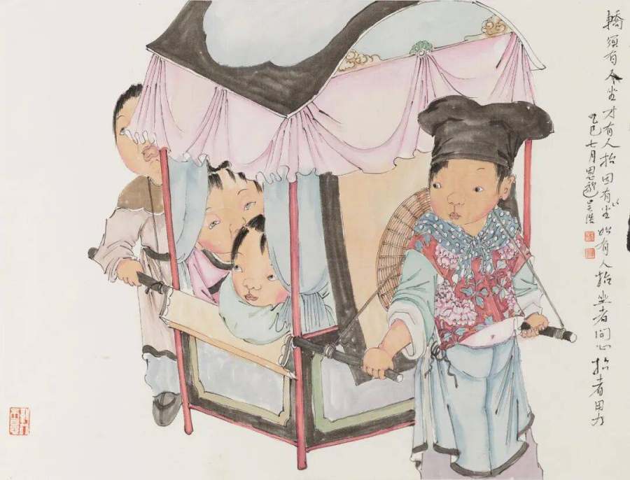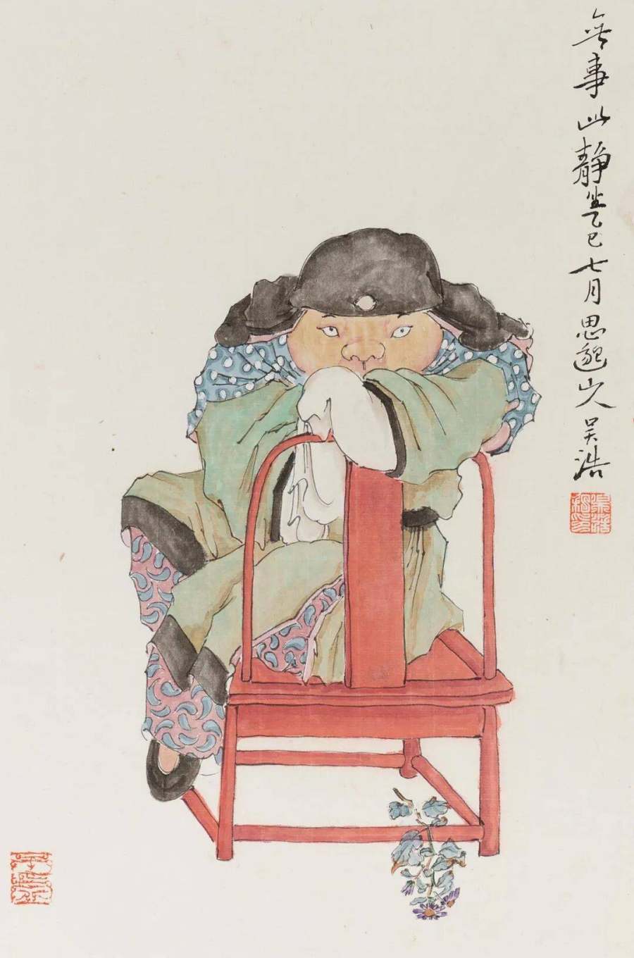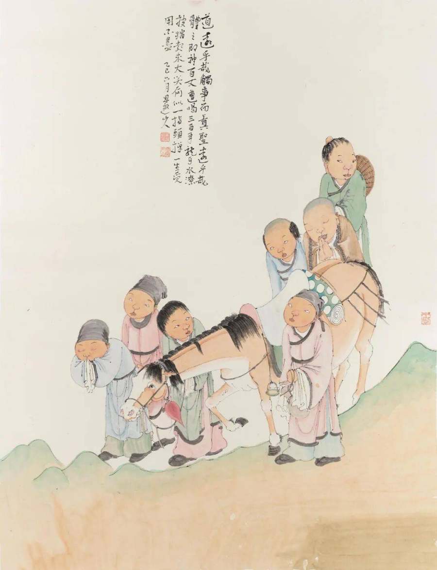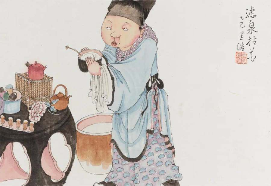 一画正是这样。以纯然的中国画语言,营造了纯粹的中国式意境。这种意境不仅是美学的,也是人生的,是入之也深、出之也安的达观;是恩怨开释的轻快、矛盾冲突的和解:是旷然,是静穆,是绚烂之极的平淡……虽然从画中题款的文字内容可见,该画的创作起兴于黄沾为香港电影《笑傲江湖》写下的主题歌《沧海一声笑》,但画家却成功地进行了视觉转换。其意义不是靠某种直白的方式图解出来的,而是靠中国画的语言,得之于视觉意境的全新构造。在此,外向的空间与内聚的形象、典雅的造型与清淡的色彩、实景与留白、静态与动态、全景与细节、精致与疏放等构成张力的视觉关系,呈现了一种中国美学意境的生成过程。当这个过程与“沧海一声笑”的主题发生唱和时,我们就开始对一种东方的智慧和人生的意境有了领悟。