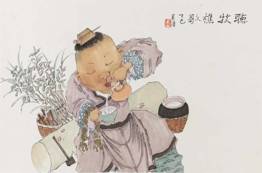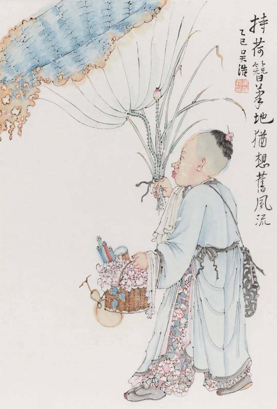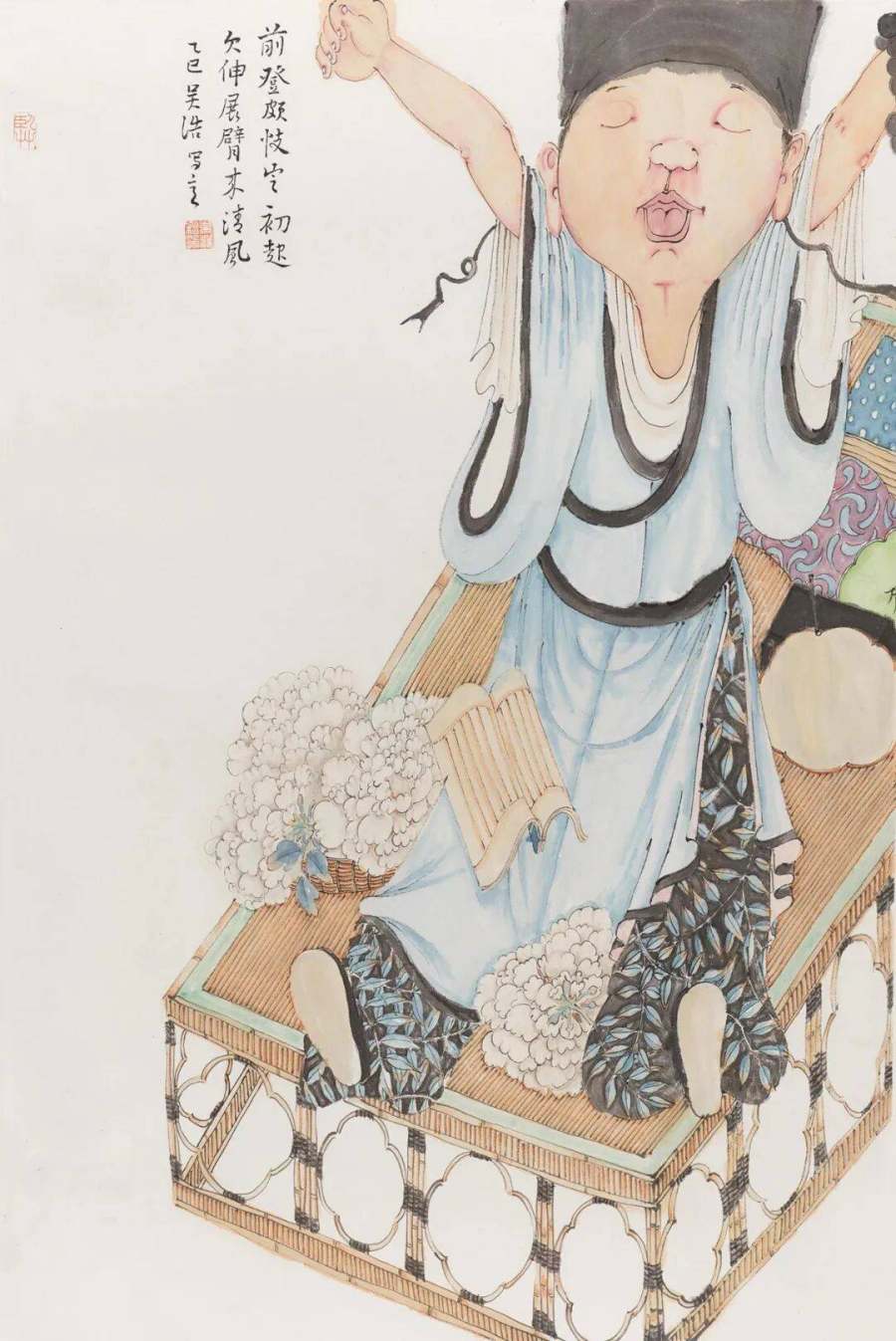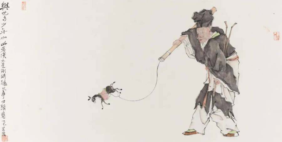 借助作品形式和内容的和谐关系,至此,我们才明白,原来在入与出之间,画家并不打算为咱们给出一个关于人生去向的答案,而不过是在呈现中国文化传统中关于人生部分的本然状态。甚至黄沾天才的词章,要紧的也非其文字内容,而首先是画家赋予的视觉状态。那是整体融入中国画章法样式的灵秀的书法,不仅平衡了构图,也拨动了琴弦……它穿越空阔的江天,风一样地把歌声传递得越来越近。