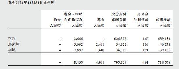 雷达财经查阅发现,“6.8亿港元”的出处来自于理想汽车2024年年报,换算成人民币为6.39亿元,包含266.5万元薪金津贴、16 万元退休金计划供款以及6.36亿元股份支付薪酬。