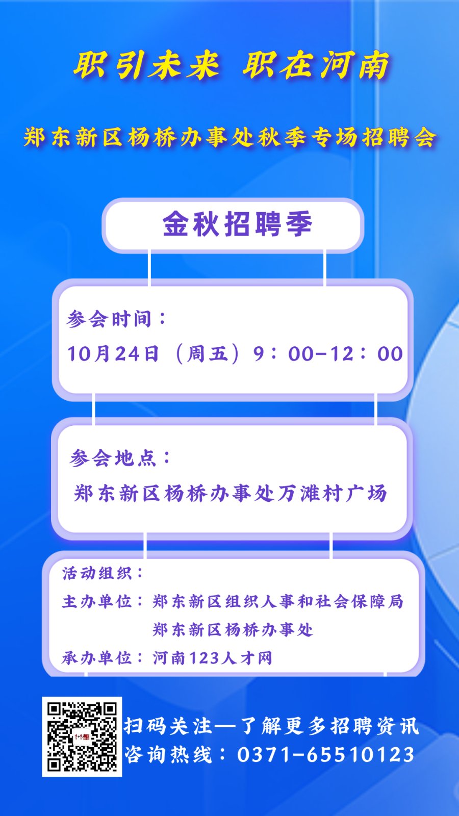 为切实缓解企业“招工难”,群众“就业难”的问题,由郑东新区组织人事和社会保障局、郑东新区总工会、杨桥党工委、办事处主办,河南123人才网承办的“职引未来、职在河南”郑东新区杨桥办事处秋季专场招聘会,将于10月24日在郑东新区杨桥办事处万滩村广场举行。