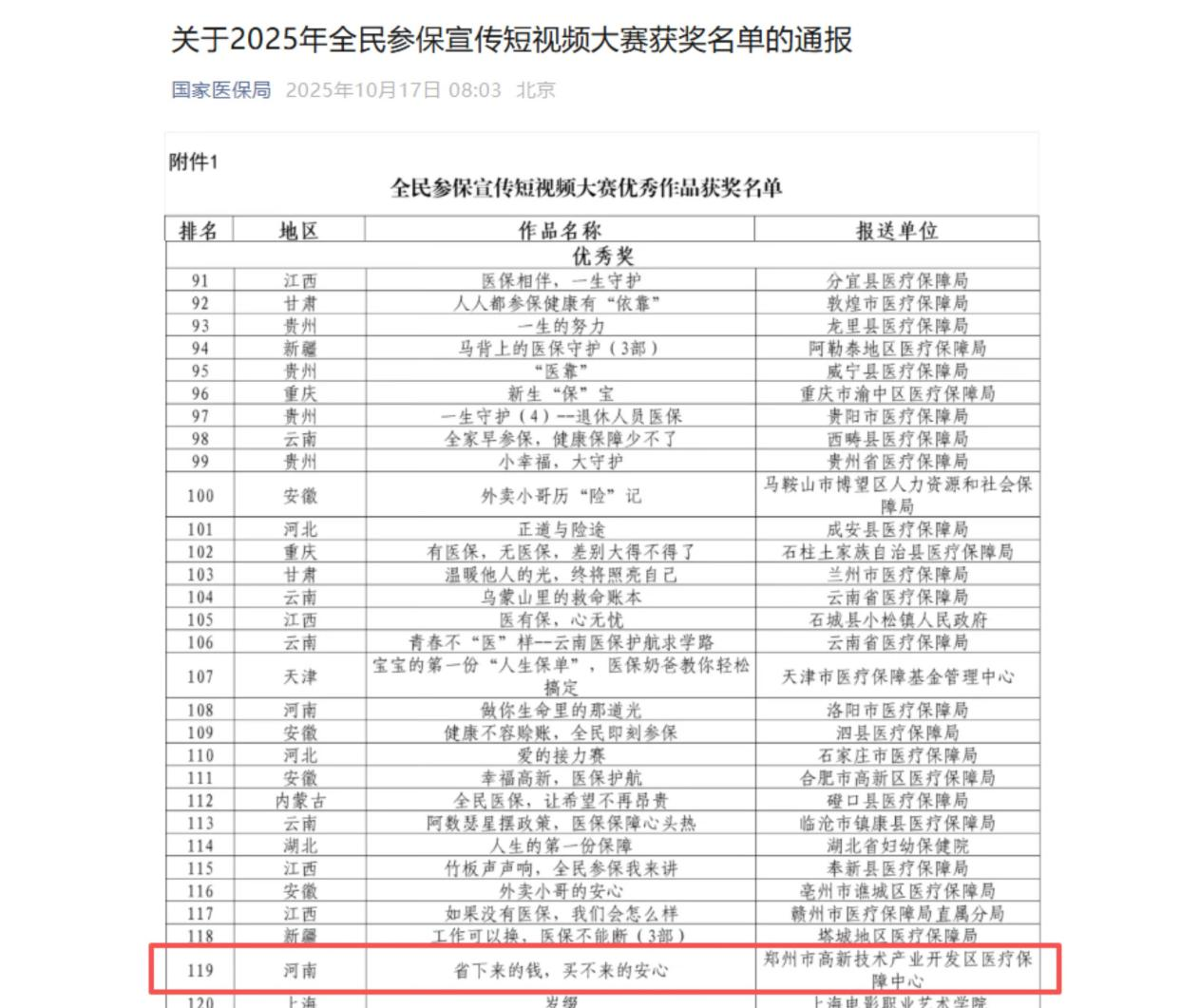 记者今日从高新区医保中心了解到,为进一步巩固全民参保成果,广泛宣传全民参保,弘扬医保正能量,激发广大人民群众参加基本医疗保险的积极性和主动性,营造“人人参与、应保尽保”的良好社会氛围,高新区医保中心积极参加了国家医保局组织的2025年全民参保宣传短视频大赛,最终获得了优秀奖。