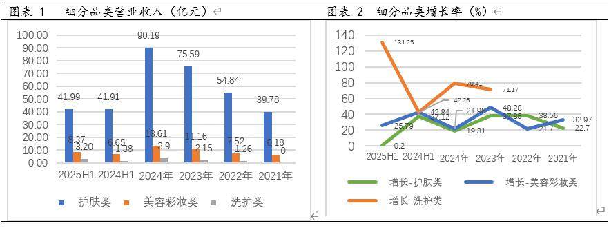 从占比来看,由于彩妆及洗护类增速持续高于护肤类,营收中护肤类占比已由21年86.55%降至25年半年报的78.4%。截止24年末,彩妆类营收13.61亿元,洗护类3.9亿元,按25年上半年数据年化,预计25年全年彩妆+洗护类营收23亿左右。