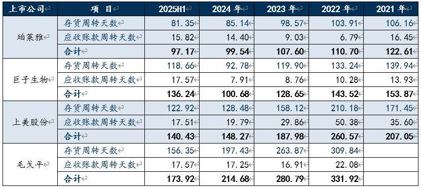 公司的核心竞争力仍体现在营运周转效率高。25年上半年存货+应收账款周转天数合计97天,而巨子生物、上美股份、毛戈平分别为136天、140天、174天。