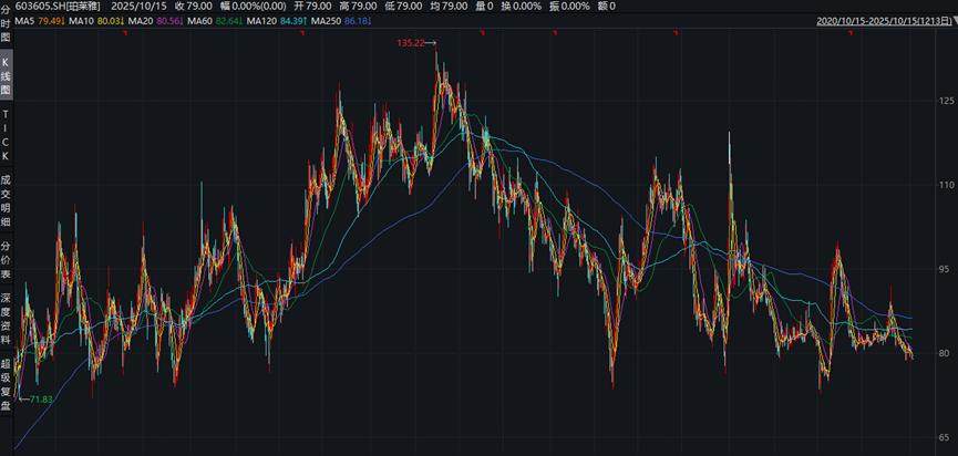 从近5年的股价走势来看,珀莱雅自2023年2月创下股价高点135.22元(前复权,即考虑分红、配股等因素),后振荡下行。10月14日收盘价77.75元,高点至今已下跌44%。