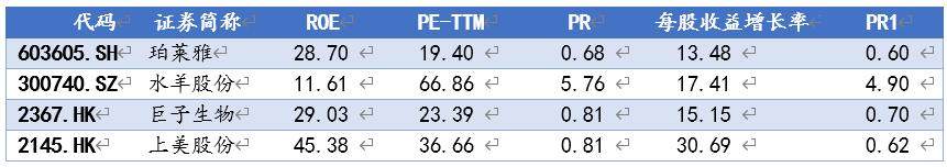 图:美护上市公司修正后的PR对比,注:PR1=PE/(ROE*(1+每股收益增长率*1%));来源:企业财报,锦缎研究院