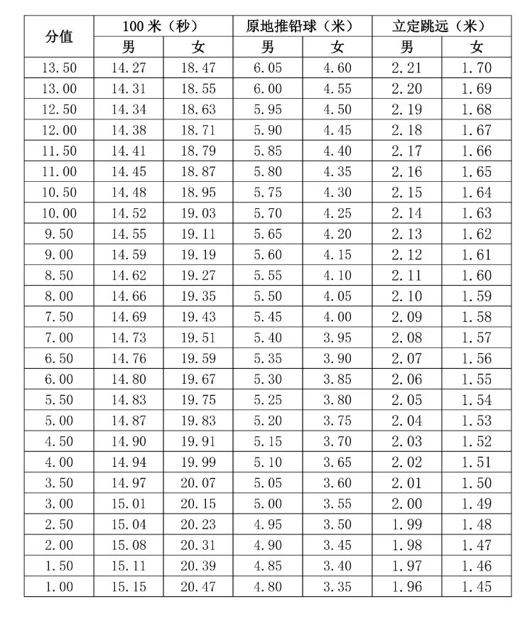 2.考试内容为:100米、原地推铅球、立定跳远三个考试项目。