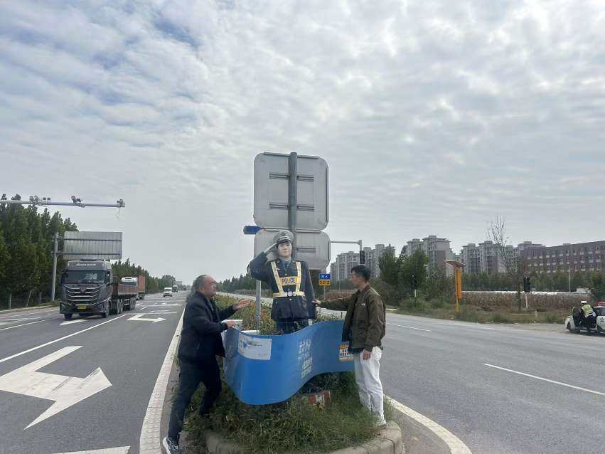 排查过程中,工作人员在S312主干道发现一处问题:道路分流区域设置的仿真交警警示模型存在破损、标识模糊等情况,难以有效发挥警示引导作用。工作人员现场对模型设施进行初步检查、记录,并联系维护单位跟进修复,同时对周边交通标识、路面标线的清晰度进行核查。