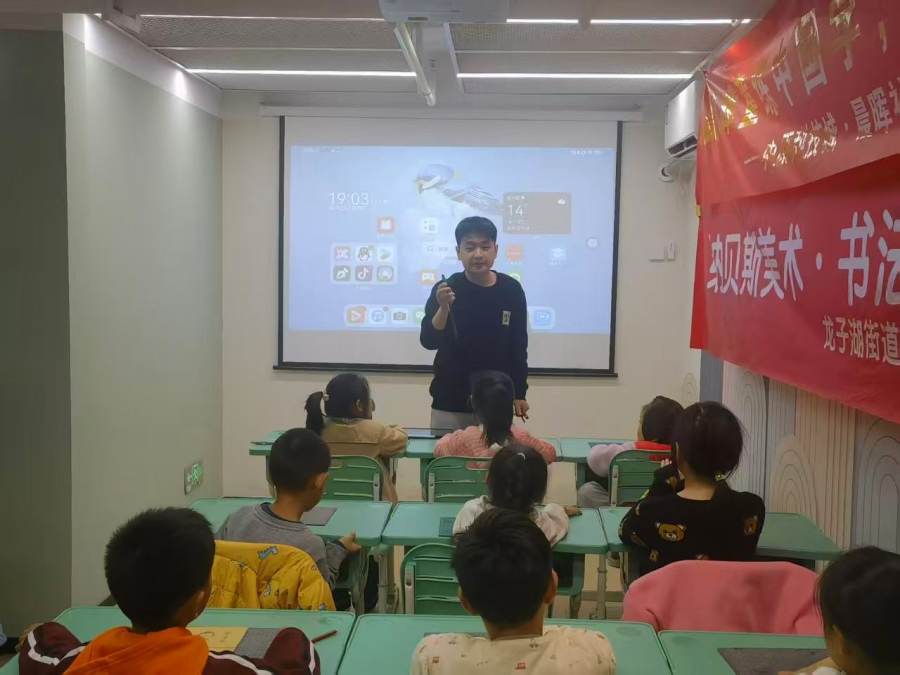 课堂伊始,孩子们先观看了爱国教育短片,在激昂的旋律与画面中,激发对祖国的热爱与崇敬之情。随后的书法教学环节,专业老师从执笔姿势教起,引导孩子们以端正的态度书写了“点、横、竖”等基础笔画。这些构成万千汉字的基石,正是传承文化、书写爱国之心的第一步。
