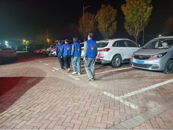 晚上 6点至8 点,村两委干部、网格员以及社区物业公司的秩序员们的队员们就会穿着反光马甲,拿着手电筒,沿着村里的主干道、小巷子巡逻。