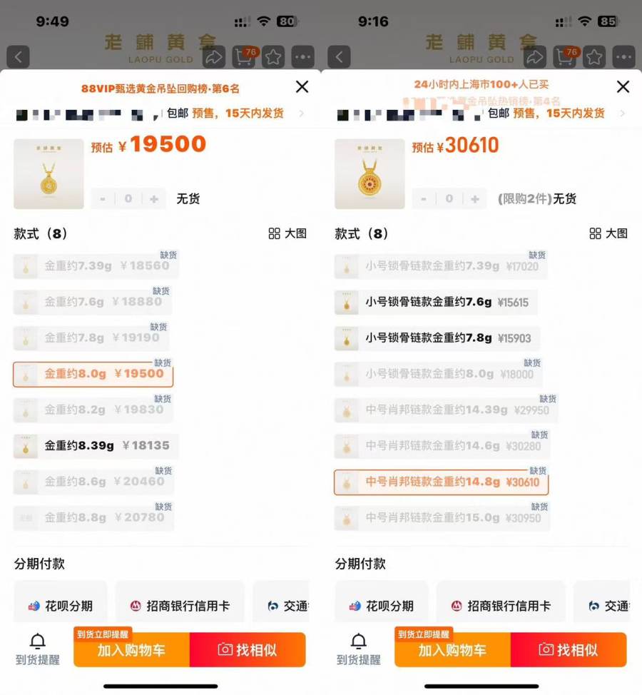蓝鲸新闻记者查询发现,十字金刚杵1号(8.39克)调价后18500元,较此前价差3500元,涨幅为23.33%;玫瑰花窗1号宝石款(14.8克)调价后30610元,较此前价差6150元,涨幅为25.15%;点钻葫芦(7.39克)调价后16750元,较此前价差2660元,涨幅为18.87%;太阳图腾(8克)调价后19500元,较此前价差3110元,涨幅为18.97%。