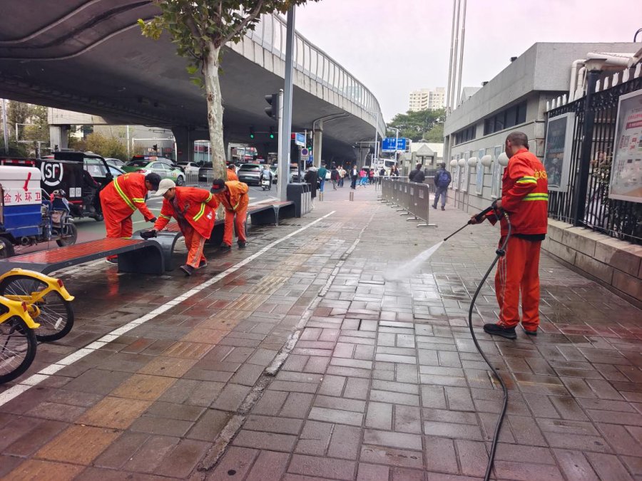首先,利用高压水枪对目标区域进行全方位、高强度的冲洗作业。高压水枪喷射出的强劲水流,能够迅速且有效地清除附着在设施表面和地面上的灰尘、油污、口香糖残渣等各类顽固杂物,随后,环卫工人手持抹布,对宣传栏和便民休息座椅进行逐一、细致的擦拭,不放过任何一个细微的污渍和灰尘,从宣传栏的边框到玻璃面板,从座椅到座面,都进行了认真清理,确保宣传栏外观明亮洁净、信息清晰可见,便民休息座椅触感清爽宜人,为市民和游客提供舒适、卫生的休憩环境。