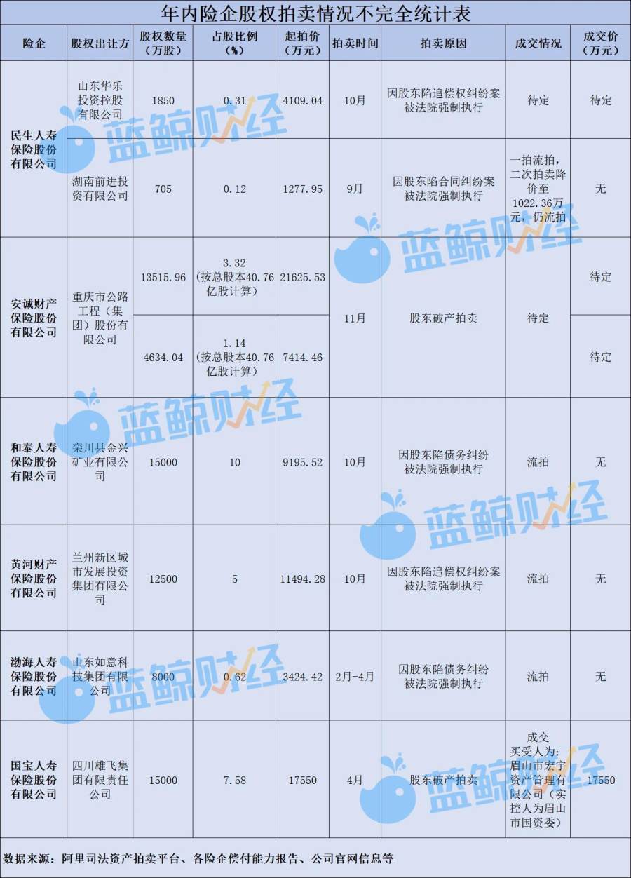 年内险企股权拍卖情况不完全统计表(图片来源:蓝鲸新闻记者制表)