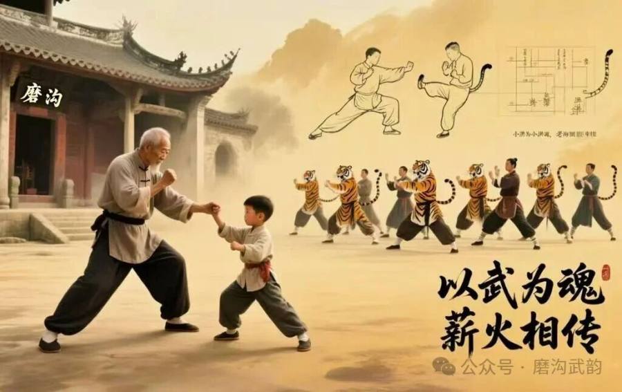 磨沟武术的魂,藏在老祠堂的脚窝里,藏在老虎社与星星怪社的表演中。未来,我们将深入挖掘小洪拳、老洪拳等传统套路的精髓,用文字、影像记录下每一招式的传承密码,确保少林余韵原汁原味流传。同时,结合现代体育科学改良教学方式,让孩童能在趣味中习练基本功,让成年人能在训练中强体魄,让老虎社、星星怪社成为武术传承的“活载体”——既保留传统武术表演的震撼,也开发面向大众的教学课程,让“功夫磨沟”不止是名号,更是人人可参与的生活方式。