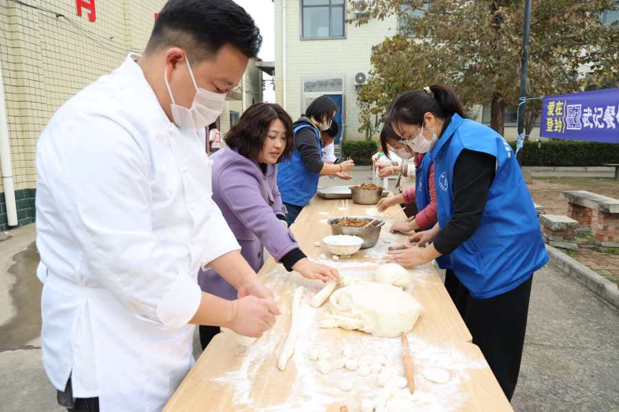 现场分工明确、秩序井然:和面的力道十足,调馅的香气四溢,擀皮的手法娴熟,包饺子的动作利落。鲜嫩的馅料被裹进雪白的面皮,一个个饱满圆润的饺子在手中成型,每一份都承载着武记餐饮对老人们的牵挂与敬意。