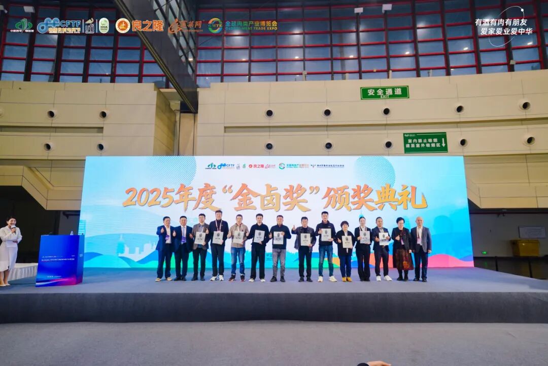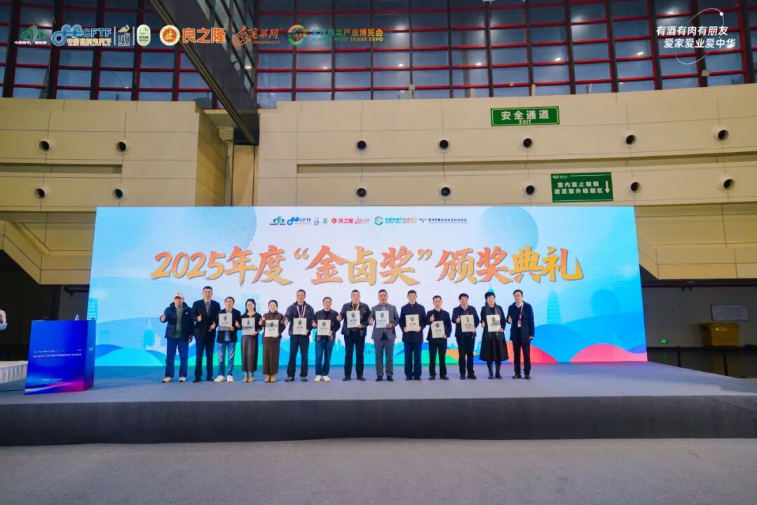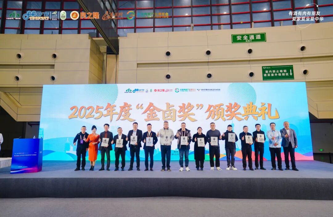 2025年度"金卤奖"颁奖仪式成为大会的亮点环节。获奖品牌来自全国不同区域,是当地卤味品牌的代表。豆记老卤、于清山、杜三珍、九多肉多、须水邓记、绝洽食品、義興張、至美斋酱牛肉、掌小鸭、大牛酱卤堂、安小卤、皖美费费、赵鸭子、金箔湖熟鸭业、燕赵侠熏肉世家、栾师傅、宜生斋、凹香村食品、张大嘴、锦禧吴小卤、阿明酱牛肉、奋斗鸭、爱德食品、新农牛肉、刘氏西施猪蹄、华旗顺熏肉、金玉盛堂、少东家猪蹄、棉二烧鸡、老崔家、劲松卤肉、清丰李记共计32家卤味品牌荣获"金卤奖",彰显了卤味产业的蓬勃发展与品牌建设成果。