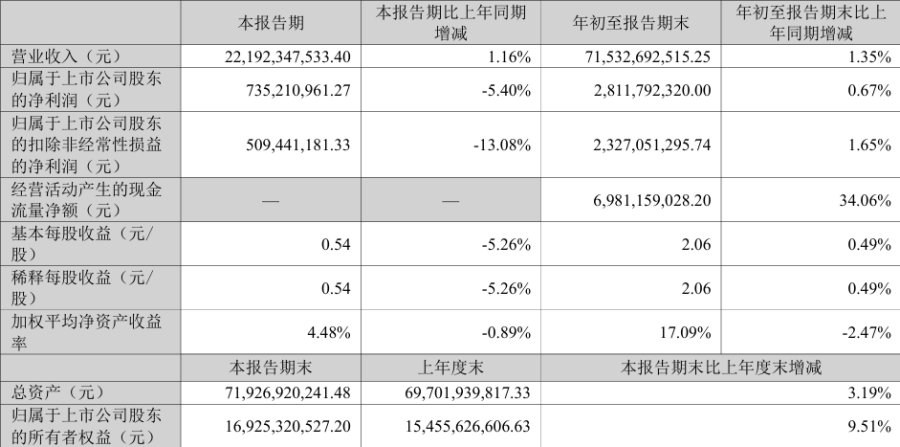 第三季度营收为221.92亿元,同比增长1.16%;归母净利润为7.35亿元,同比下降5.40%。前三季度营收为715.33亿元,同比增长1.35%;归母净利润为28.12亿元,同比增长0.67%。