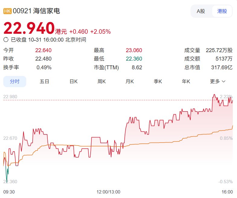 10月30日,海信家电港股盘中一度跌超7%,最低触及22.3港元/股。截至10月31日收盘,报22.94港元/股,涨2.05%,总市值317.69亿元。值得一提的是,截至7月31日收盘,海信家电港股市值约为361亿元,三个月缩水超40亿港元。