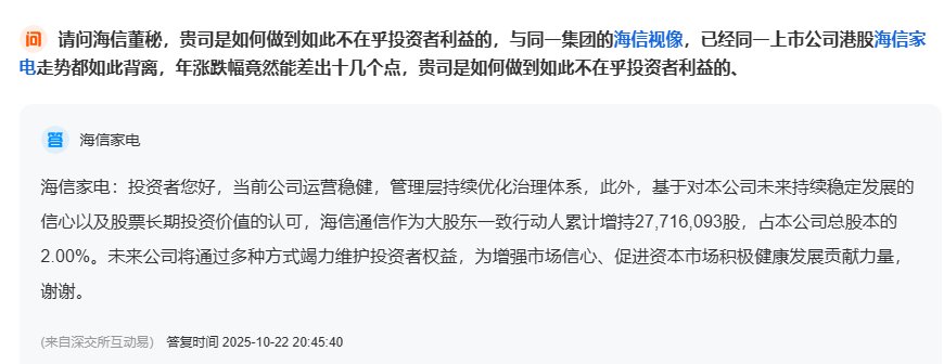 东方财富“问董秘”板块,不少投资者直接向海信家电“开炮”,就近年市值下滑提出不满:“请问海信董秘,贵司是如何做到如此不在乎投资者利益的,与同一集团的海信视像,已经同一上市公司港股海信家电走势都如此背离,年涨跌幅竟然能差出十几个点......”