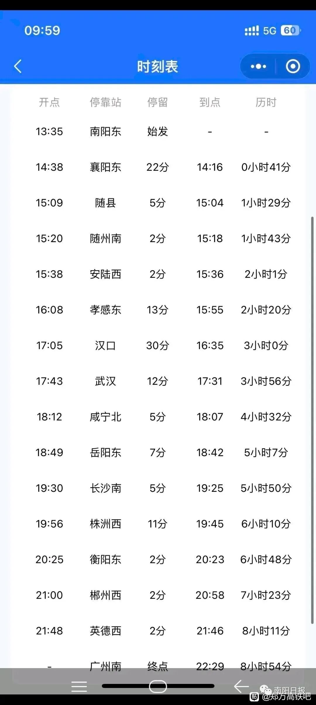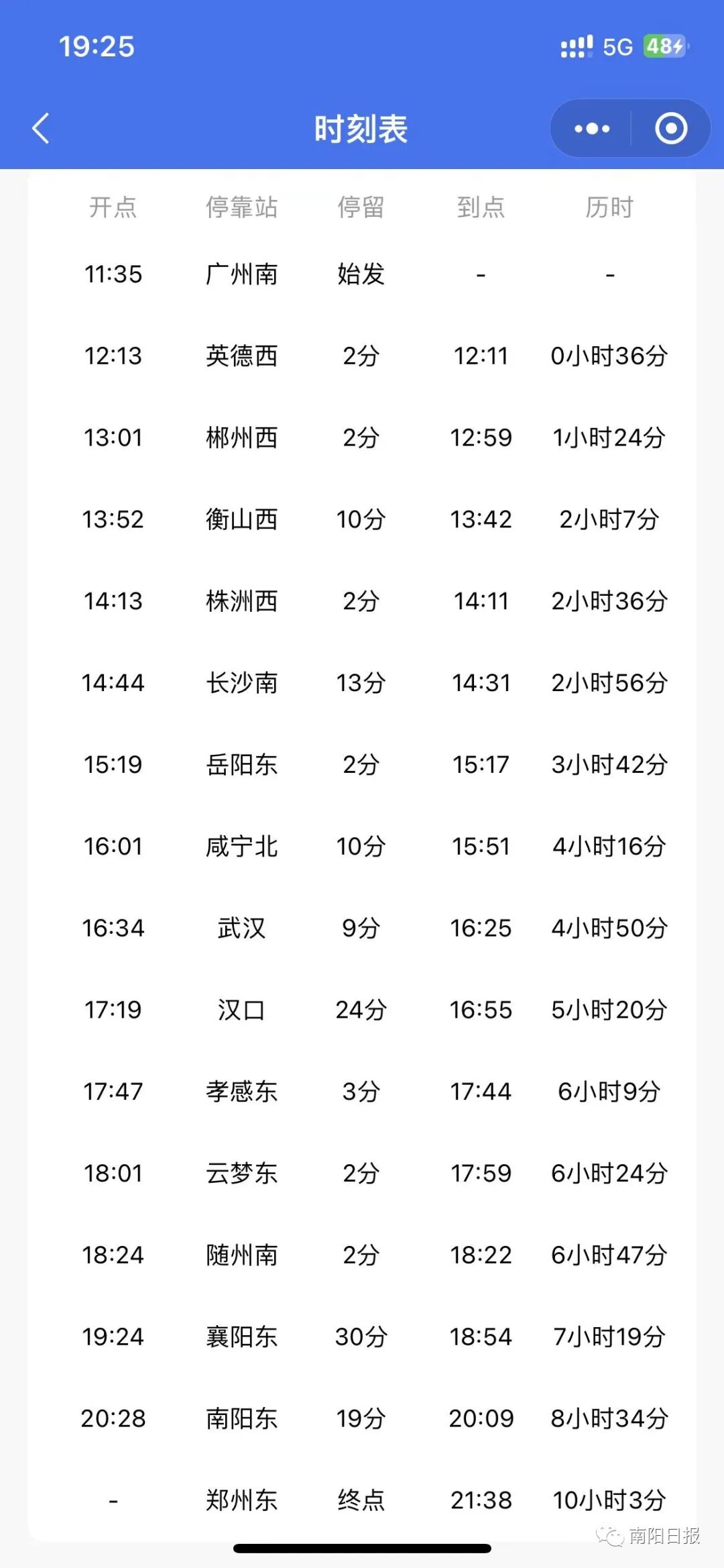 据了解,该高铁列车时刻如下:G1151次列车13:35从南阳东站始发,22:29到达广州南站,全程运行8小时54分,中途停靠襄阳东、汉口、武汉、岳阳东、长沙南、株洲西、衡阳东等站;G1152次列车11:35从广州南站始发,20:09到达南阳东站,全程运行时间8小时34分,中途停靠郴州西、衡山西、长沙南、岳阳东、咸宁北、武汉、汉口、襄阳东等站。