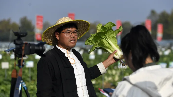 直播镜头扫过,手臂粗长的丝瓜,体大肉厚的巨型南瓜,顶花淡紫的花椰菜,捏一下就要爆出汁水的樱桃番茄……果蔬种类丰富、让人食指大动。远处的大棚和田间,三两人影绰约其中,隐约有嬉笑声传来,一派归农田园的闲适与安逸。