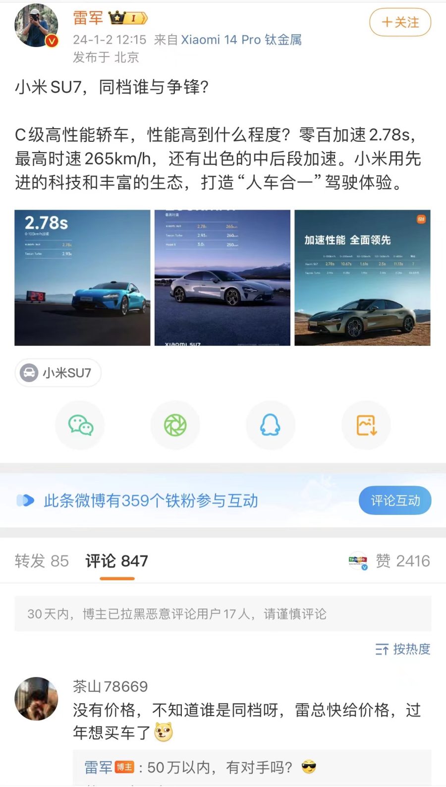 记者也注意到,在评论区有网友表示,没有价格,不知道谁是同档呀?雷总快给价格。对此雷军回复到:“小米SU7在50万以内,有对手吗?”