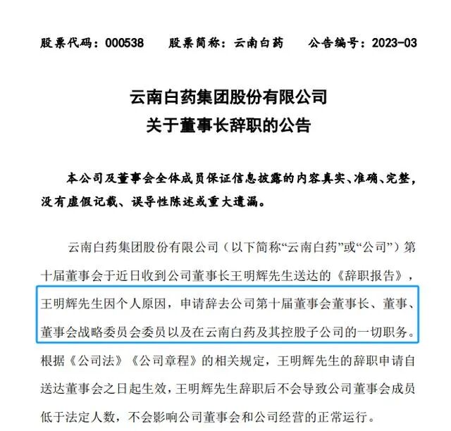 2023年3月,云南白药发布公告称,收到王明辉送达的《辞职报告》,其因个人原因申请辞去董事长、董事、董事会战略委员会委员以及在云南白药及其控股子公司的一切职务。