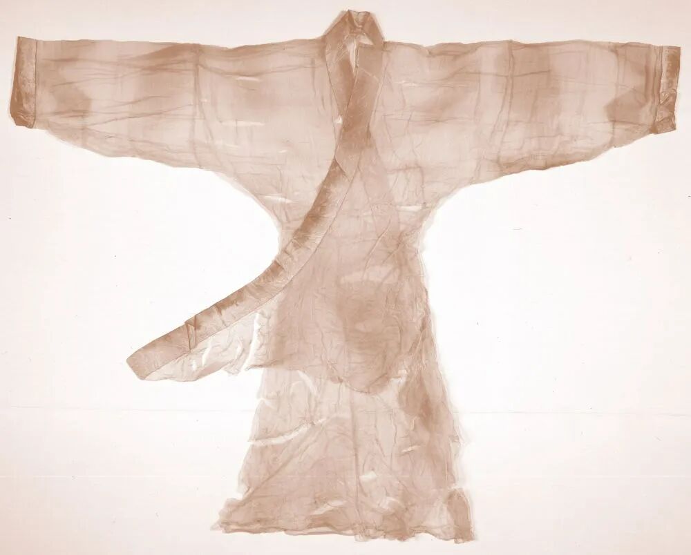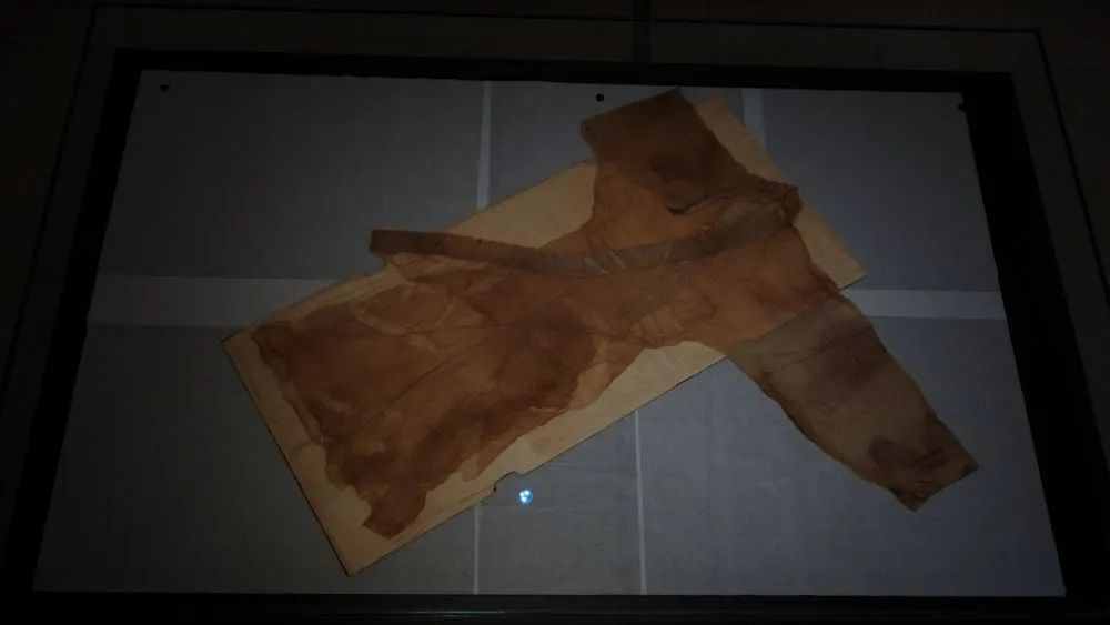 素纱单衣被誉为西汉时期纺织技术的巅峰之作,也是目前最早、最薄、最轻的服装,出土于马王堆一号汉墓,也就是辛追墓。据史料记载,辛追是西汉长沙国丞相利苍的妻子,去世时年约50岁,其生活的年代距今2200多年。中方策展人、湖南博物院博士后许宁宁告诉记者,湖南博物院在网上征集网民最期待在此次展览中看到的中方文物时,投票最高的是素纱单衣。“素纱单衣有两件,一件是直裾,一件是曲裾,都是右衽。其中,直裾的是49克,衣长128厘米;曲裾的是48克,衣长160厘米。曲裾的素纱单衣在工艺上相对更高超,因为它更长、更宽,却还轻1克。”许宁宁说,“直裾素纱单衣在馆内马王堆汉墓基本陈列中常年展出,此次展览中,我们特意安排了这件从未对外展出过的曲裾素纱单衣真品。”曲裾素纱单衣(真品)(6月14日摄)。湖南博物院供图