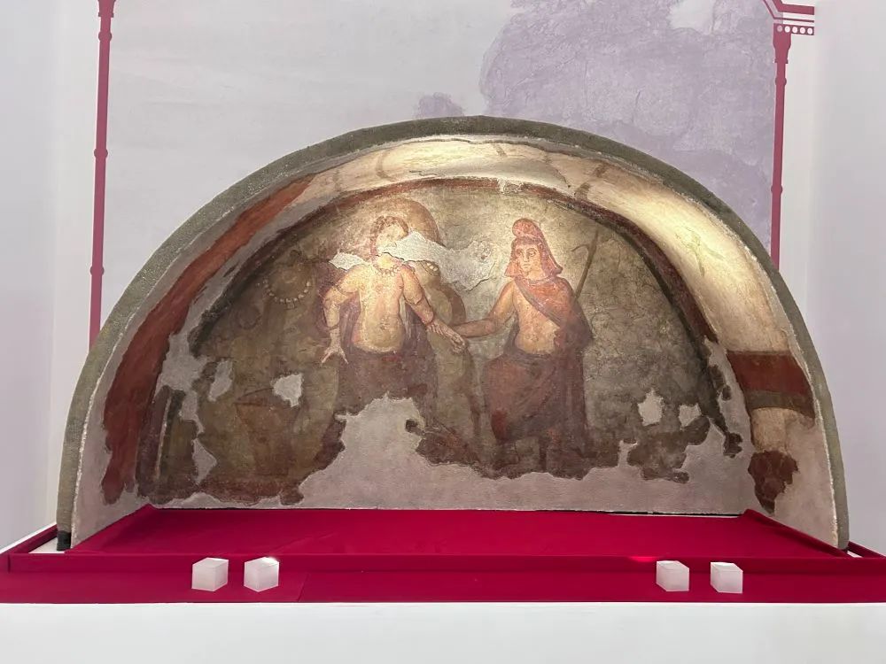 在这次展览上,罗马珍品“描绘珀耳修斯和安德罗墨达的彩绘石膏壁画”是自卡比托利欧博物馆入藏以来首次对外展出。“这幅半月形壁画来自公元4世纪后半叶,描绘了英雄救美的神话故事。”罗马文化遗产监督管理局局长克劳迪奥·帕里西·普雷西切接受新华社记者专访时说,此次罗马展出的138件/套展品主要来自卡比托利欧博物馆,均为首次在中国展出。“描绘珀耳修斯和安德罗墨达的彩绘石膏壁画”(真品)(6月13日摄)。新华社记者 张玉洁 摄