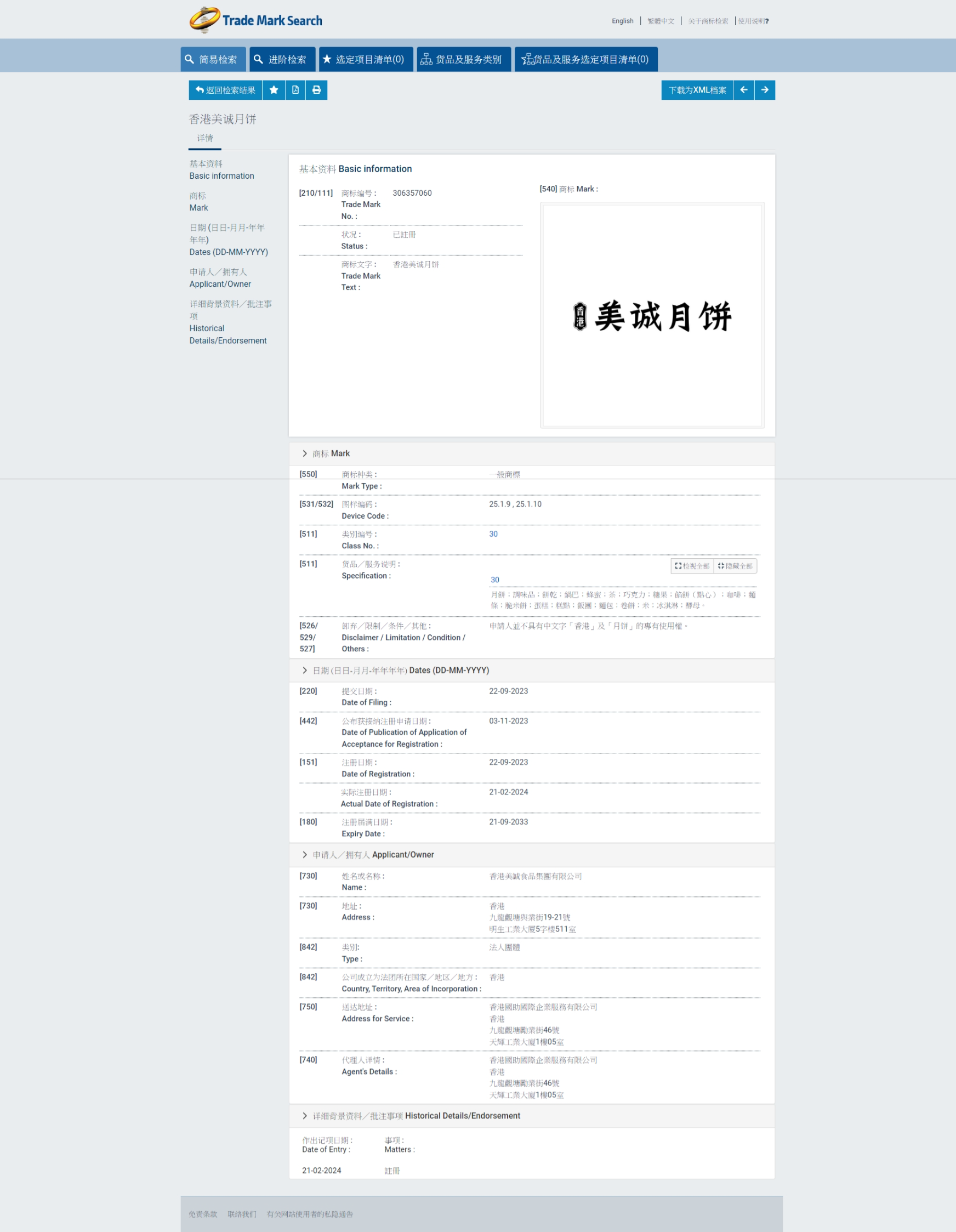 “香港美诚月饼”字样、图样的商标注册日期为2023年9月22日。
