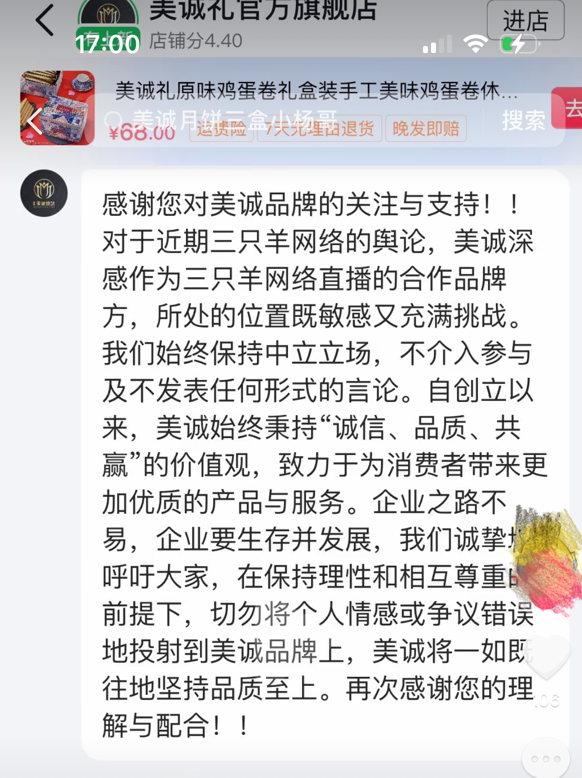 澎湃新闻注意到,根据网友晒出的截图,美诚礼食品官方旗舰店客服回复消费者时称,对于近期三只羊网络的舆论,美诚深感作为三只羊网络直播的合作品牌方,所处的位置既敏感又充满挑战,“我们始终保持中立立场,不介入参与及不发表任何形式的言论”。