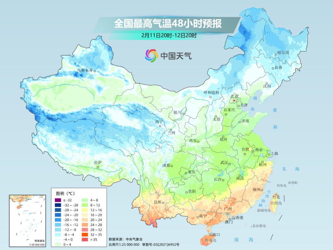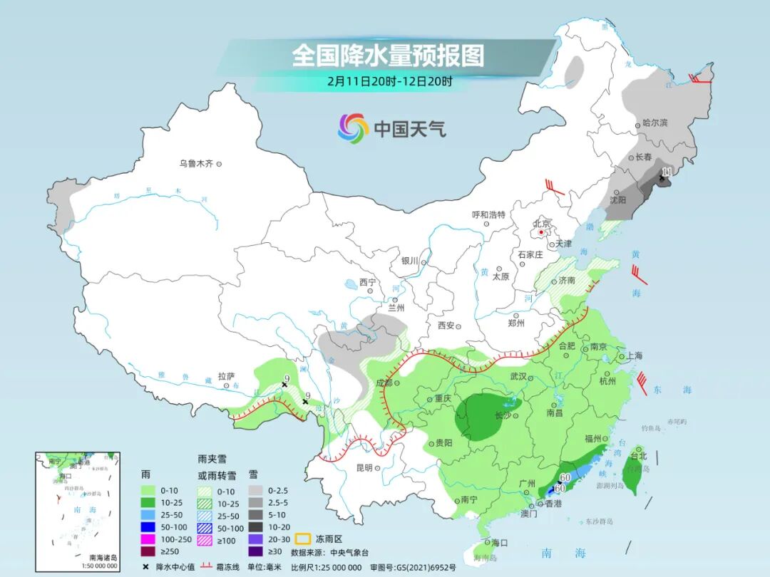 中央气象台预计,2月11日至12日,东北、华北部分地区、西北地区东部部分地区、黄淮及西藏中东部、川西高原、江汉西部有小到中雪或雨夹雪;其中11日夜间长白山区有中到大雪,局地暴雪,南方大部地区有小到中雨;12日白天,广东东部、福建东南部、台湾岛南部局地大到暴雨。