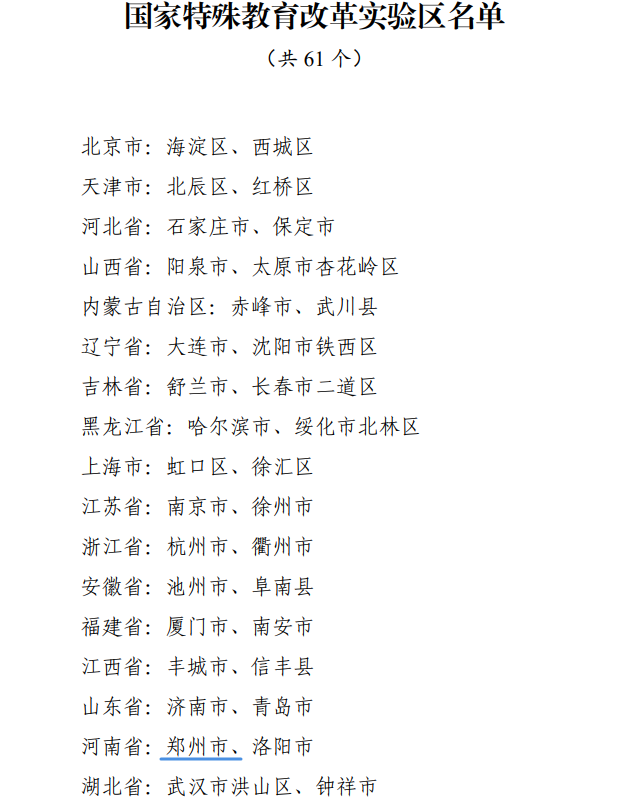 近日,教育部办公厅印发通知,经各地自主申报、省级推荐、网络公示等环节,认定北京市海淀区等61个国家特殊教育改革实验区。其中郑州市入选。
