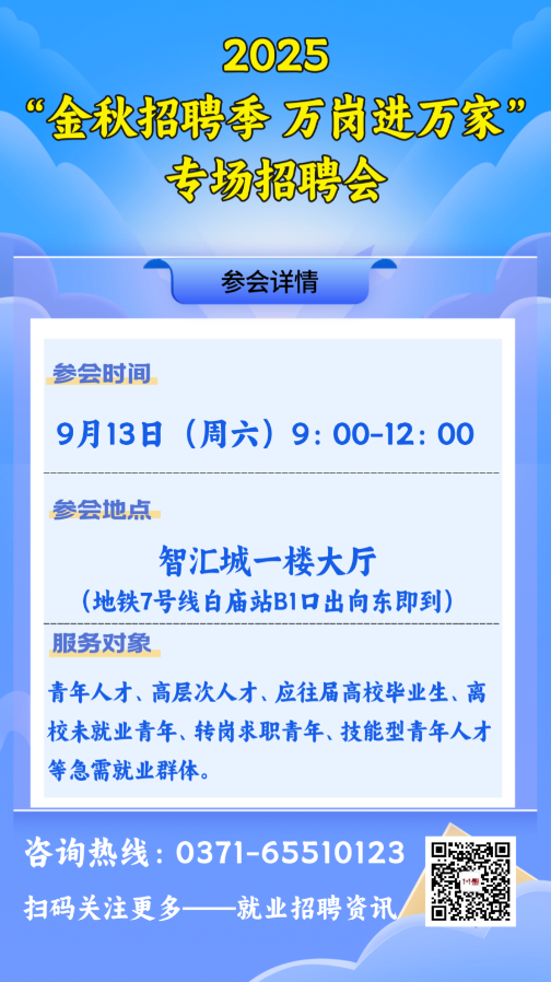 9月8日,记者从郑州市金水区人力资源和社会保障局获悉,9月13日(周六)上午,该局和金水区东风路街道办事处联合河南123人才网,将在智汇城一楼大厅举办2025“金秋招聘季 万岗进万家”专场招聘会活动。