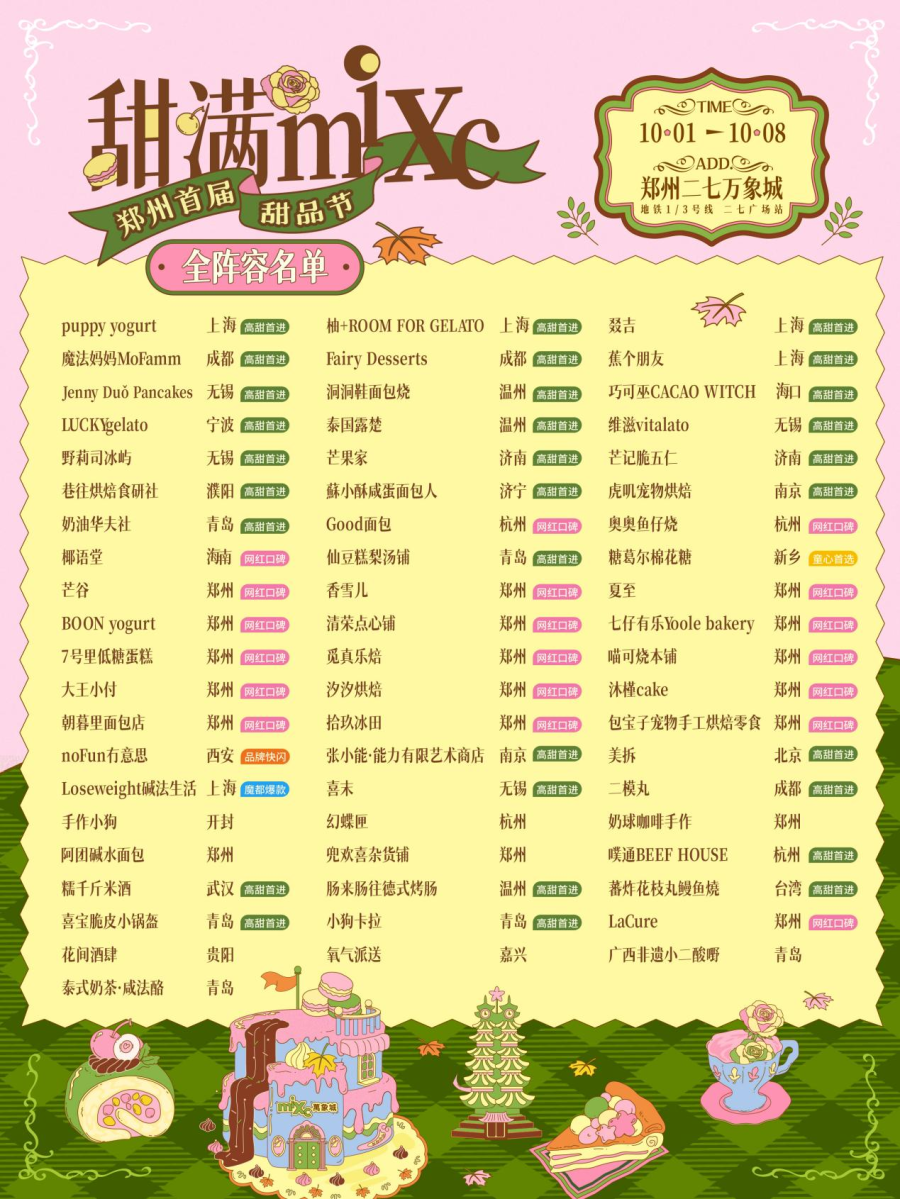 本届甜品节汇聚全国22座城市的60个网红品牌,10月1日-8日持续八天,打造中原地区规模空前的甜蜜盛宴。