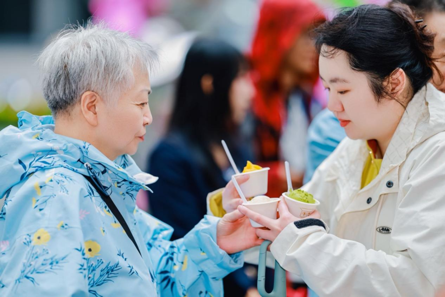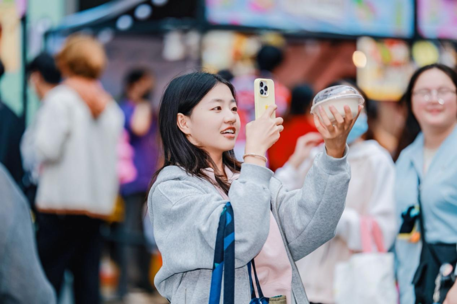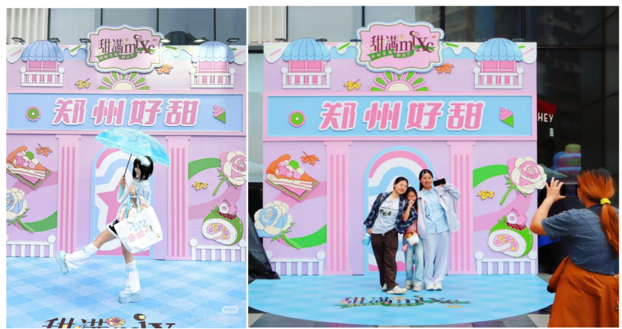 据不完全统计,入场人次已突破10万。甜品节还特别设置“郑州好甜”主题打卡区及印有二七塔元素的文创周边——“包甜的”包包、冰箱贴,众多游客雨中布景前留念。