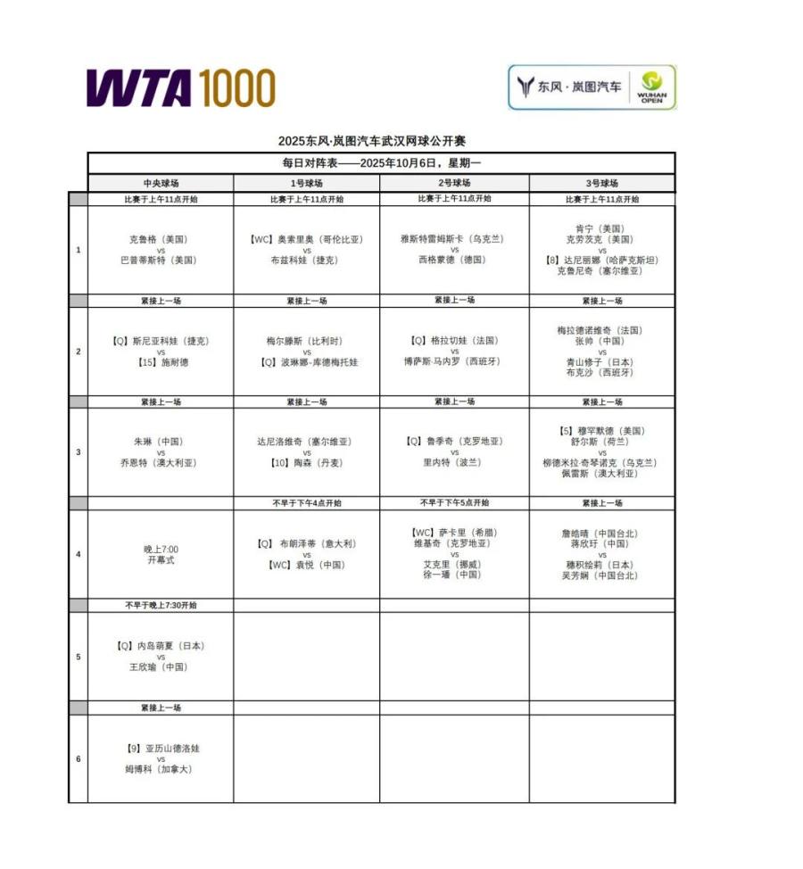 另外,张帅/梅拉德诺维奇、徐一璠/艾克里、蒋欣玗/詹皓晴将于10月6日出战女双首轮比赛。
