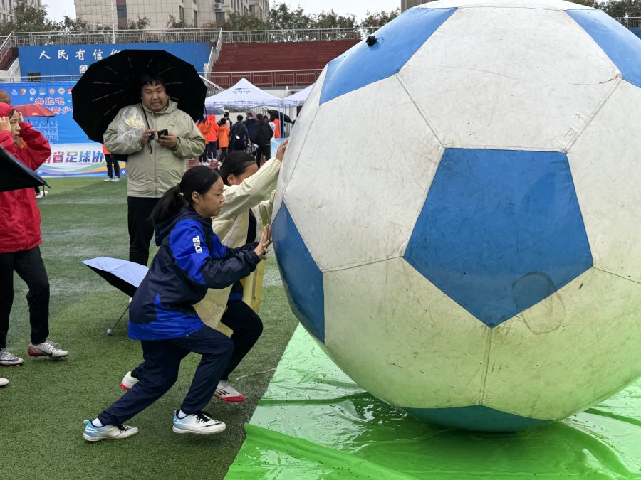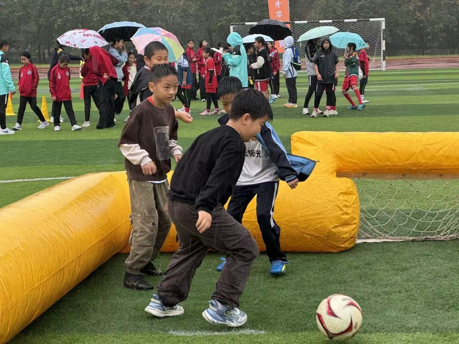 在球场上设置的趣味游戏区,是当天活动的“主舞台”,雨水并未浇灭大家的热情,反而为嘉年华增添了别样的趣味。孩子们在雨中穿梭,为了集齐奖章换取心仪礼品而全力挑战:足球九宫格前,参与者瞄准分值区奋力射门,三次机会里为累计12分全力冲刺;充气足球场上,5人小队默契配合,每球必争;障碍赛赛道上,参赛者带球穿梭,尽量避免碰倒障碍以缩短用时……每一次射门,每一次得分,甚至每一次跌倒都能引来欢呼声一片,让快乐的气氛弥漫在整个球场。